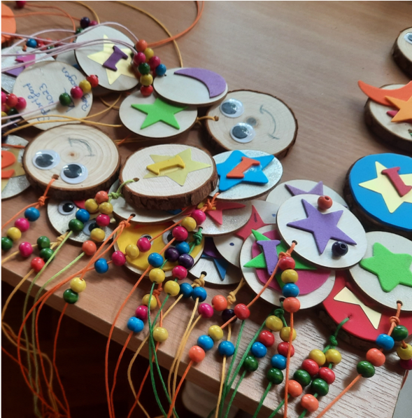 Wir haben gemeinsam mit den Erzieherinnen Elterncafés veranstaltet. Dabei wurden Bastelmöglichkeiten angeboten, um die Kita schöner zu gestalten oder um für das Sportfest Medaillen zu basteln.